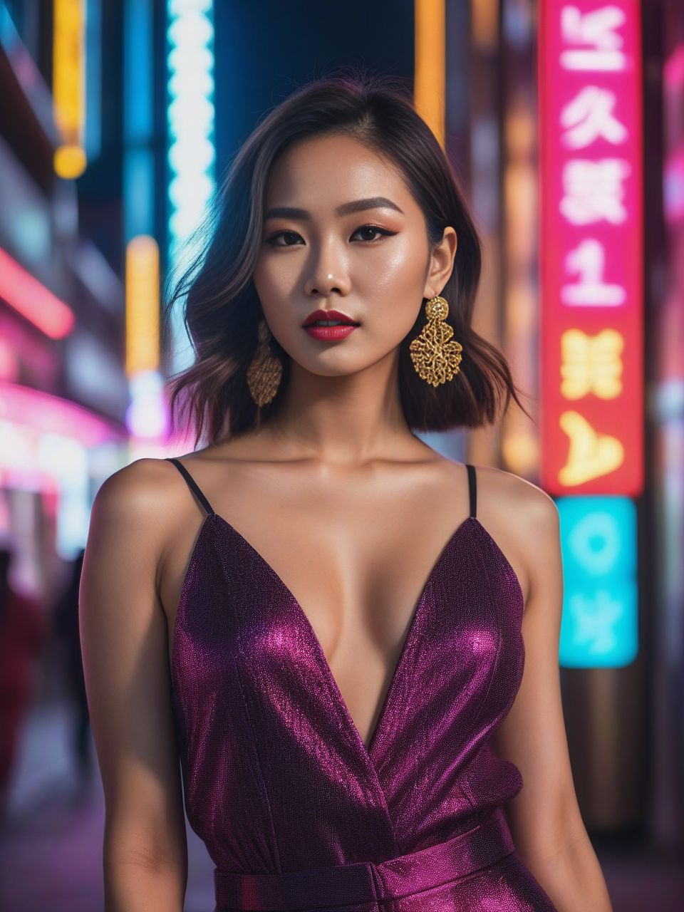 A Far Eastern Instagram model, sublime in a contemporary outfit, amidst the neon lights of a bustling city.