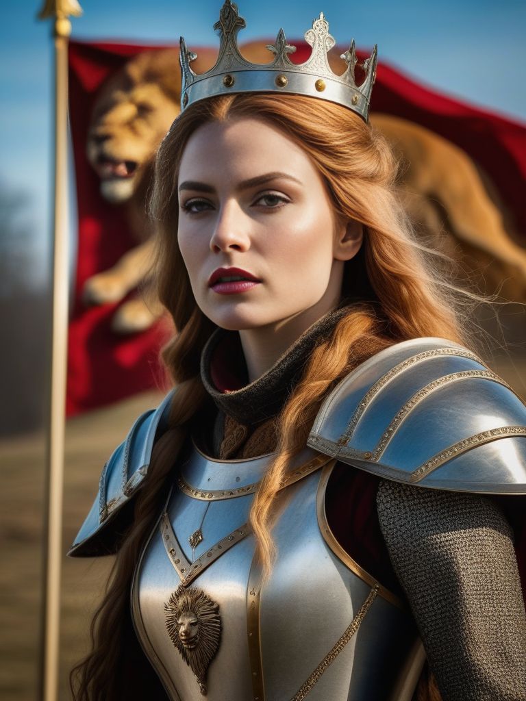 In this stunning image, a fierce queen stands tall and powerful, her regal face commanding attention. The backdrop of a medieval battlefield adds to the intensity and drama of the scene. Inspired by The Lion in Winter, this image captures the strength and determination of a powerful female ruler. Perfect for historical projects, fantasy themes, or any design that requires a touch of royalty and power.
