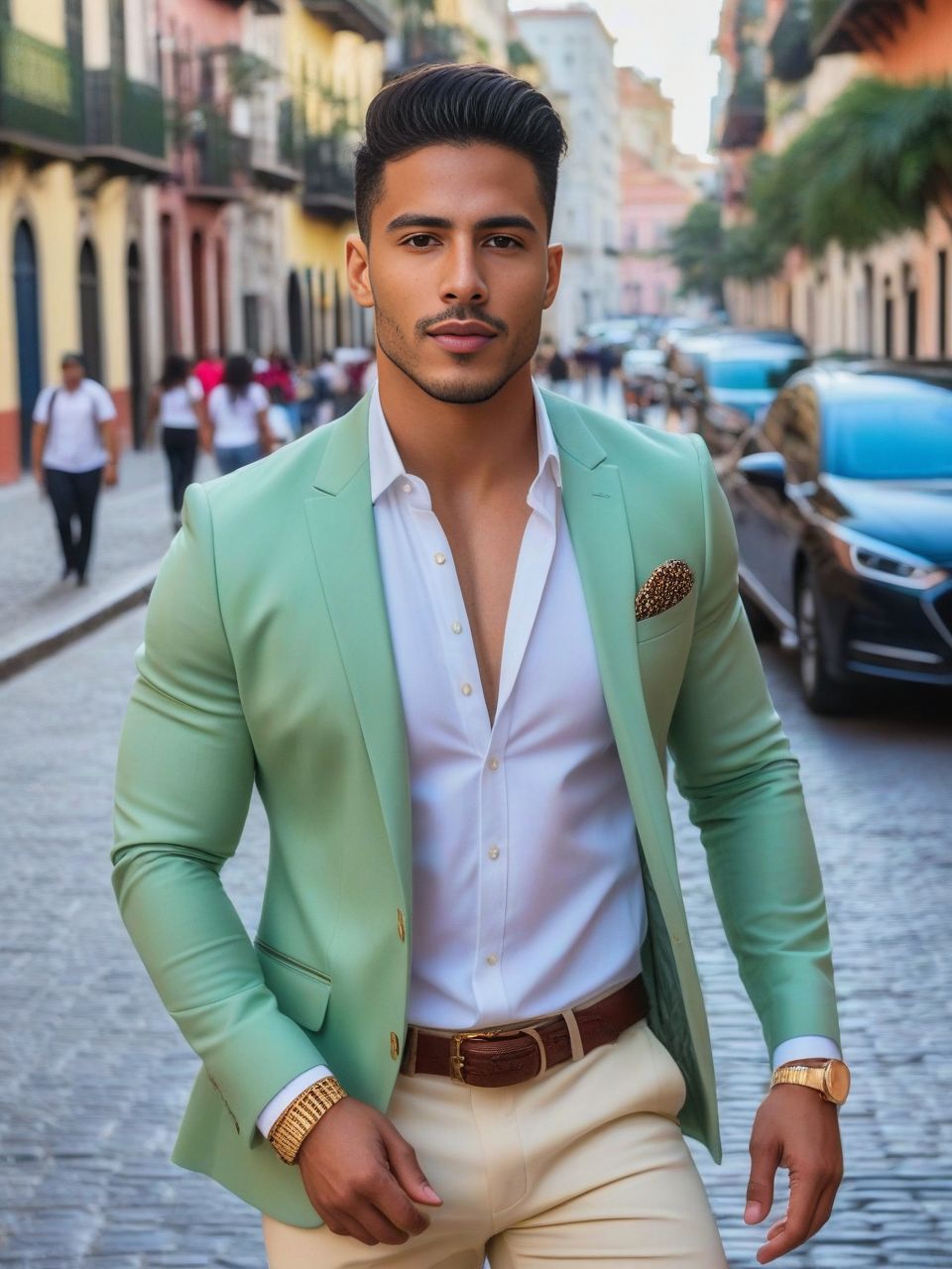 A Hispanic male Instagram model, dashing in a fashionable outfit, in a historic Latin American city.