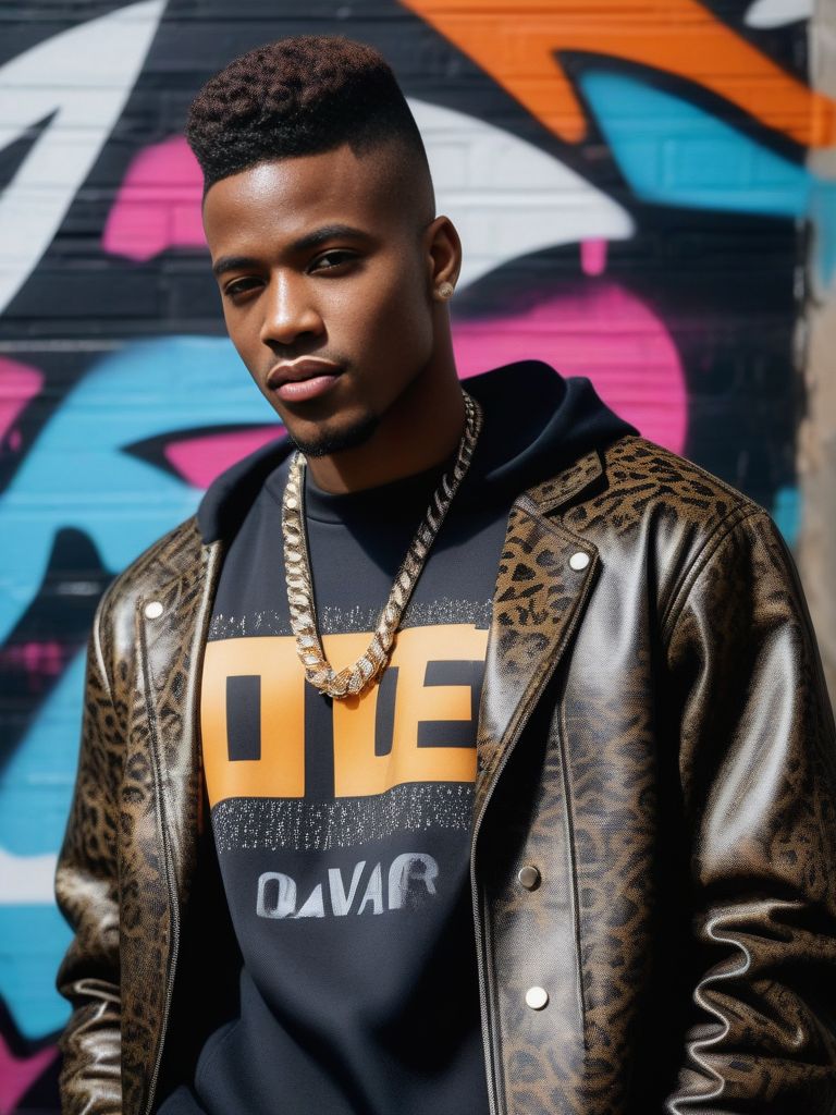 An African-American glam man with a trendy fade haircut, wearing a stylish streetwear ensemble, in an urban, graffiti-style studio setting.