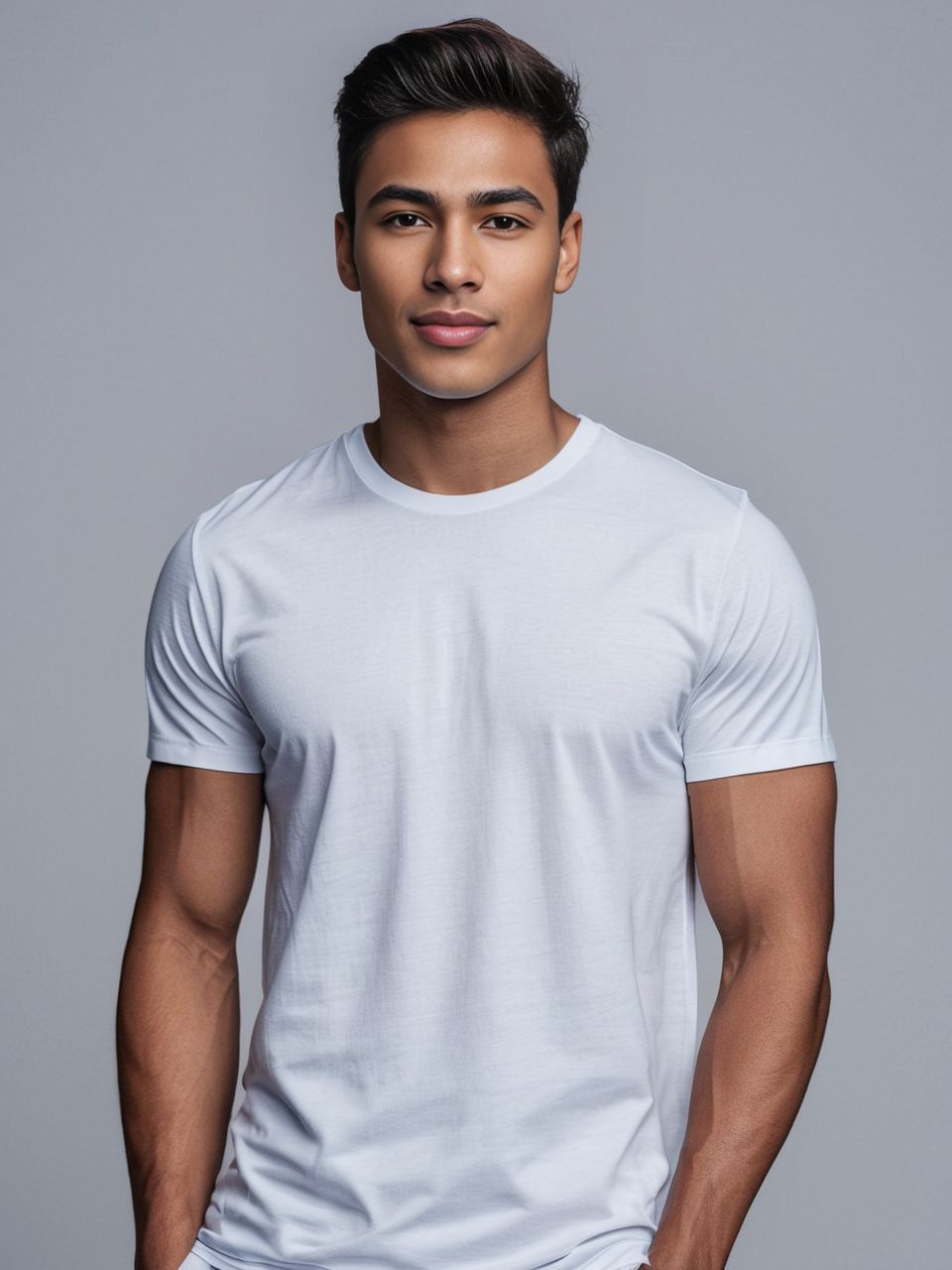 A stylish young man with beautiful almond skin tones showcases a white t-shirt against a soft gray background in a minimalistic pose, perfect for shirt model designs. The simplicity and elegance of the composition make it ideal for various creative projects.
