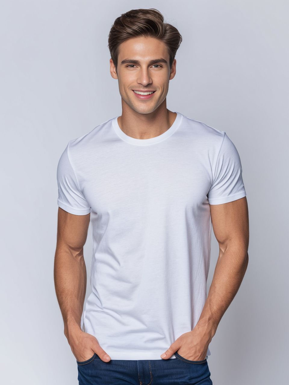 A stylish young man with an almond-toned complexion is elegantly presenting a white t-shirt model in a minimalist setting. The simplicity of the white background enhances the focus on the apparel, creating a versatile and trendy look for various design projects.