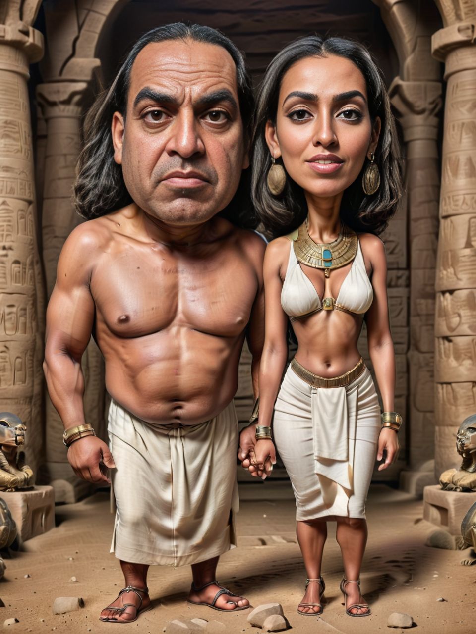 Ancient Egyptian couple caricature portrait, full body, Latino couple, big head, holding huge scarabs