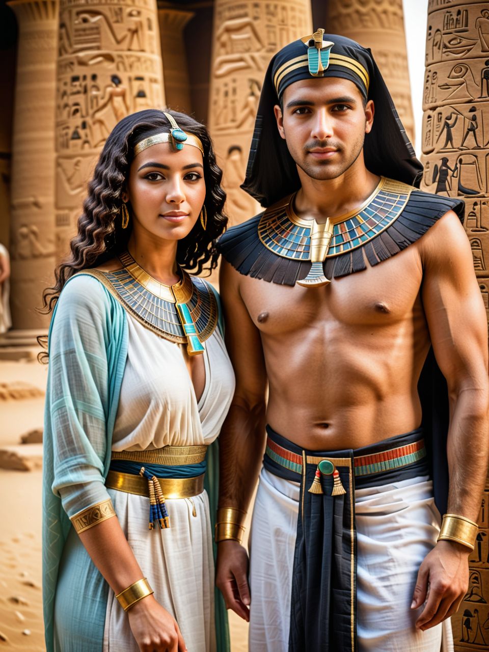 A captivating portrayal of an ancient Egyptian man and woman dressed in traditional Egyptian clothing, exuding elegance and cultural richness in a half-body portrait. Explore the allure of history and heritage in this mesmerizing depiction.
