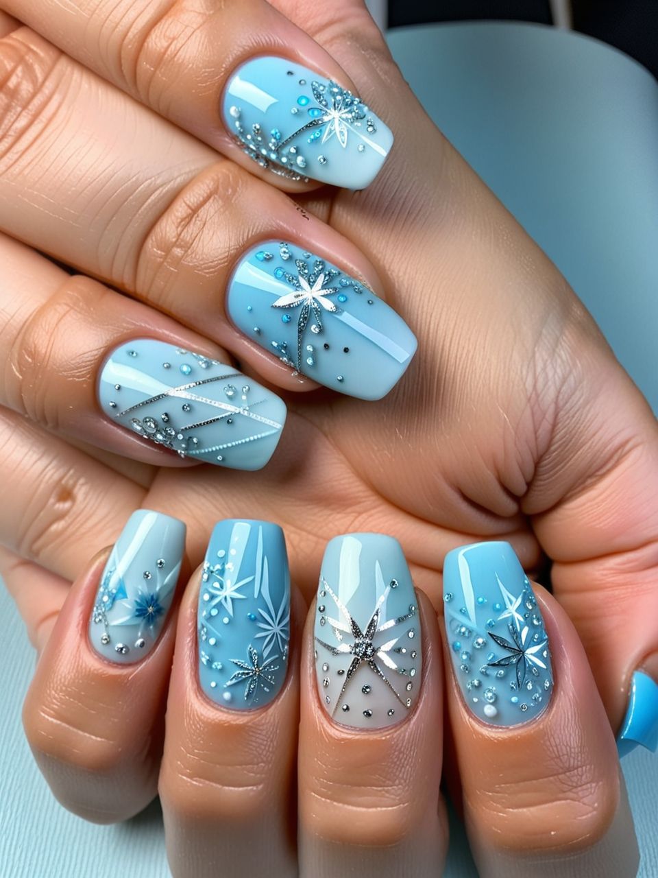 Arctic ice gel nail art with crystalline patterns and icy blues on short, stiletto nails, chillingly beautiful for pale skin.