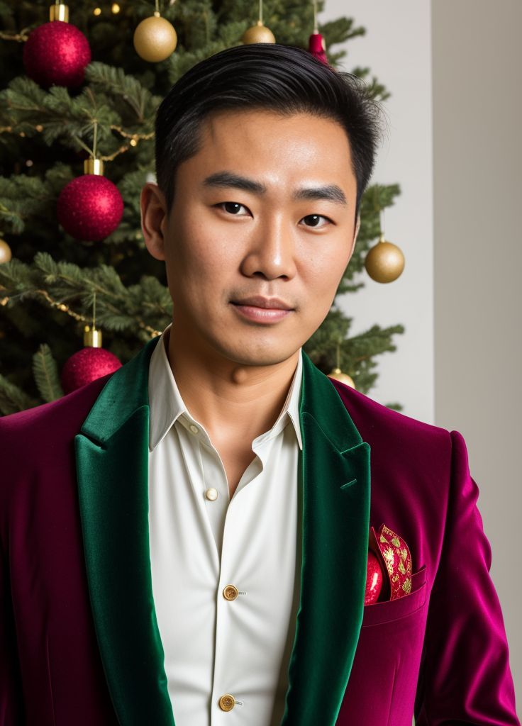 This professional headshot features an Asian man wearing a stylish green velvet blazer. The background showcases a tastefully decorated tree with red baubles. Perfect for business or personal use.