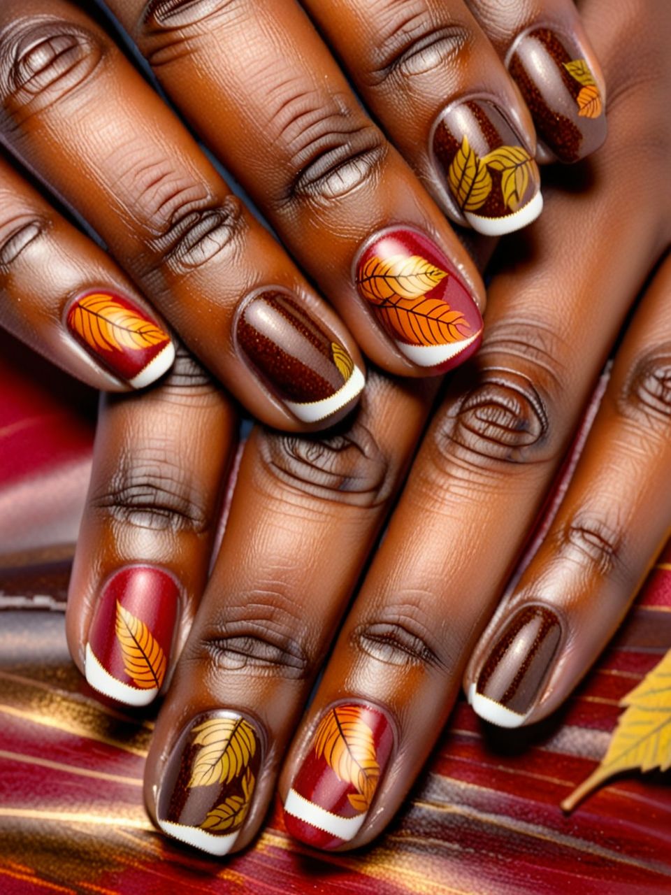 Autumn leaves gel nail art featuring rich browns and reds on long, stiletto nails, seasonal and vibrant for dark, melanin-enriched skin.