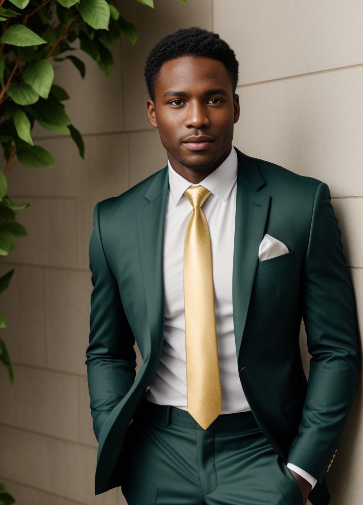 A black man is posing for a formal business headshot. He is wearing a deep green suit, a crisp white shirt, and a gold tie. The image portrays professionalism and confidence. This photo can be used for various purposes such as corporate websites, business presentations, and marketing materials.