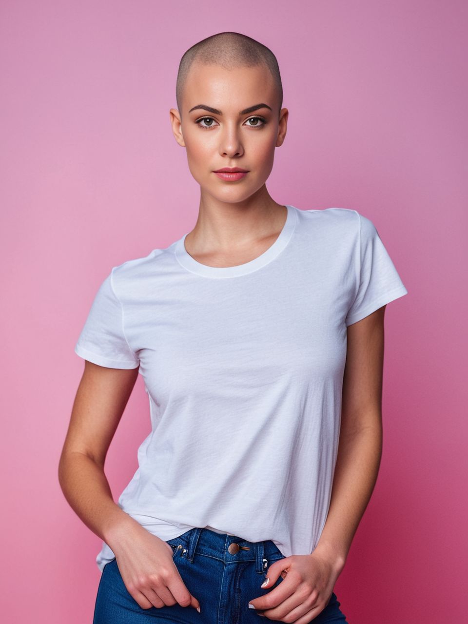 Embracing her unique style, a bold and beautiful young woman confidently showcases a white t-shirt in a striking full-body pose. Her shaved head adds to her fierce look, standing out against the soft gradient background. This image captures individuality and strength.