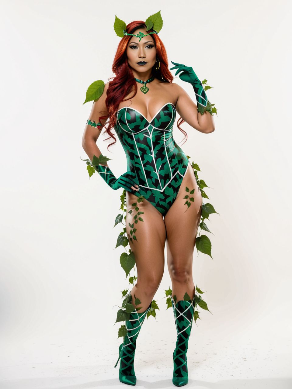 A stunning Native American woman in her thirties embodies the character of Poison Ivy, exuding confidence and allure. Her vibrant costume contrasts beautifully against a pristine white background, creating a visually striking image that captivates the viewer’s attention.