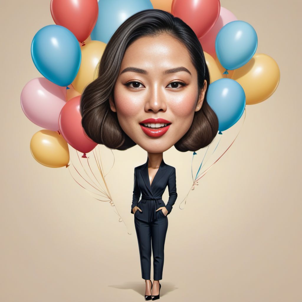 This is a caricature of a young beautiful Asian woman. She is wearing a chic outfit and holding a bouquet of balloons. The image is full body and captures the joy and vibrancy of the moment. Perfect for adding a touch of fun and excitement to your projects.