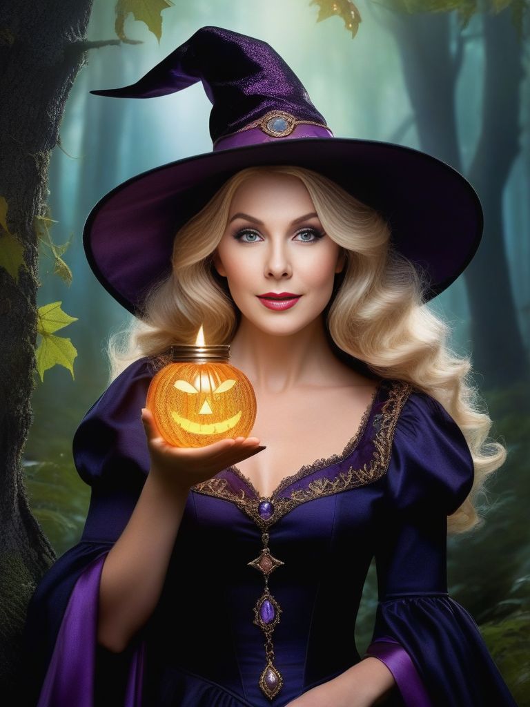 In this captivating image, a charming witch with a sparkling face is depicted in an enchanting forest. The scene is inspired by the popular TV show Bewitched. The witch’s magical presence is evident as she stands amidst the whimsical surroundings. The combination of the mystical atmosphere and the witch’s allure creates a truly mesmerizing picture. This image is perfect for adding a touch of magic to any project or design.