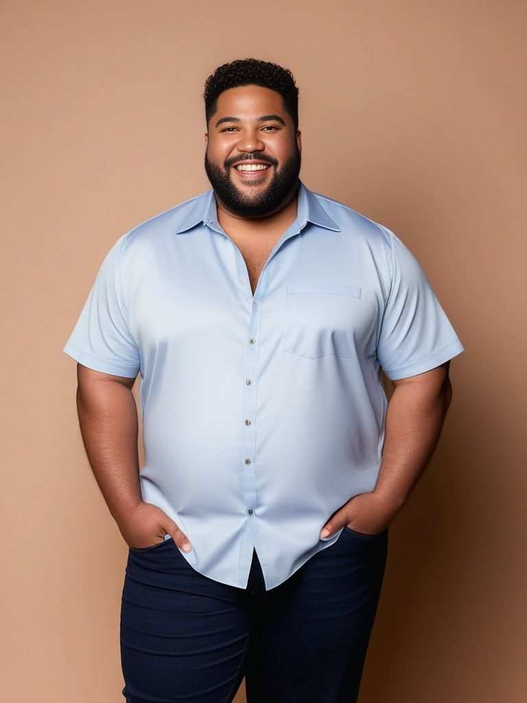 A cheerful plus-size man of mixed race is captured in a hip and modern attire. He stands confidently against a light brown gradient background, exuding a sense of style and confidence. This image is perfect for projects that celebrate diversity, body positivity, fashion, and modern lifestyle. With his vibrant personality and trendy outfit, this man is sure to bring a touch of joy and inclusivity to any creative endeavor.