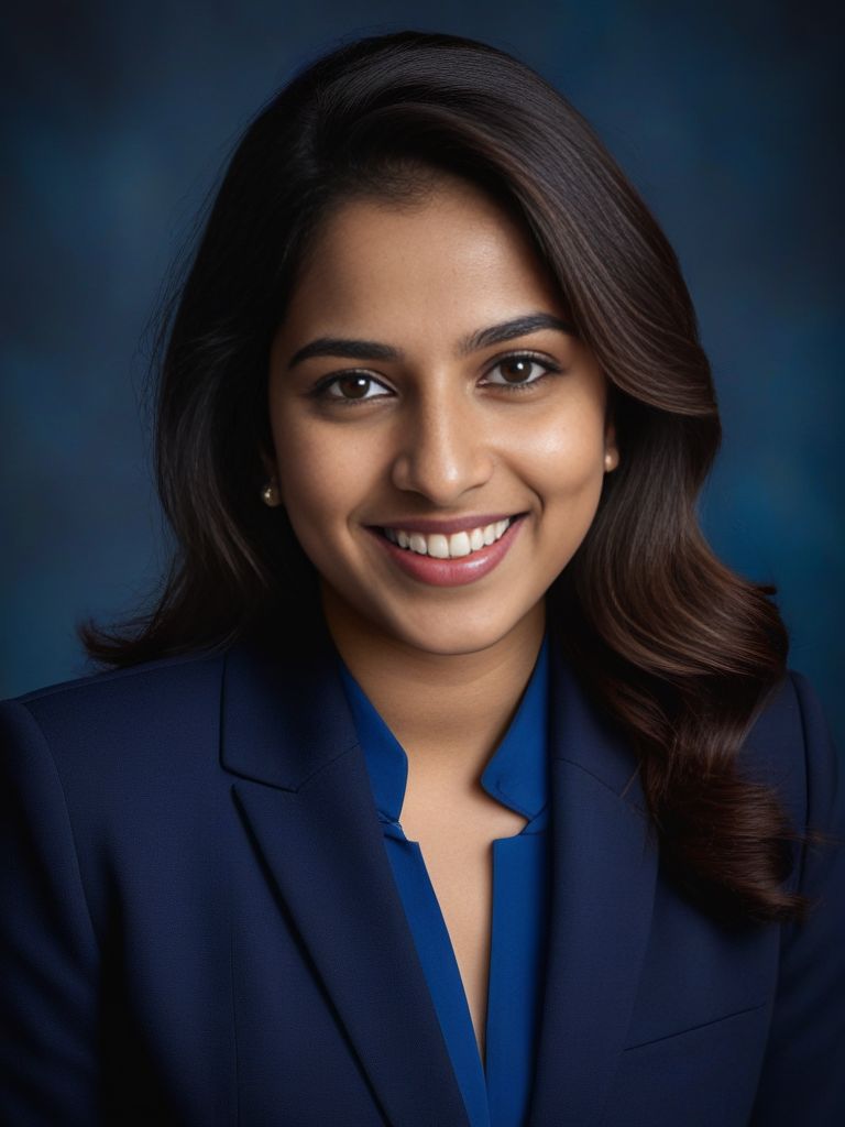 Full body headshot of a cheerful young South Asian woman, tailored navy suit, dark setting.