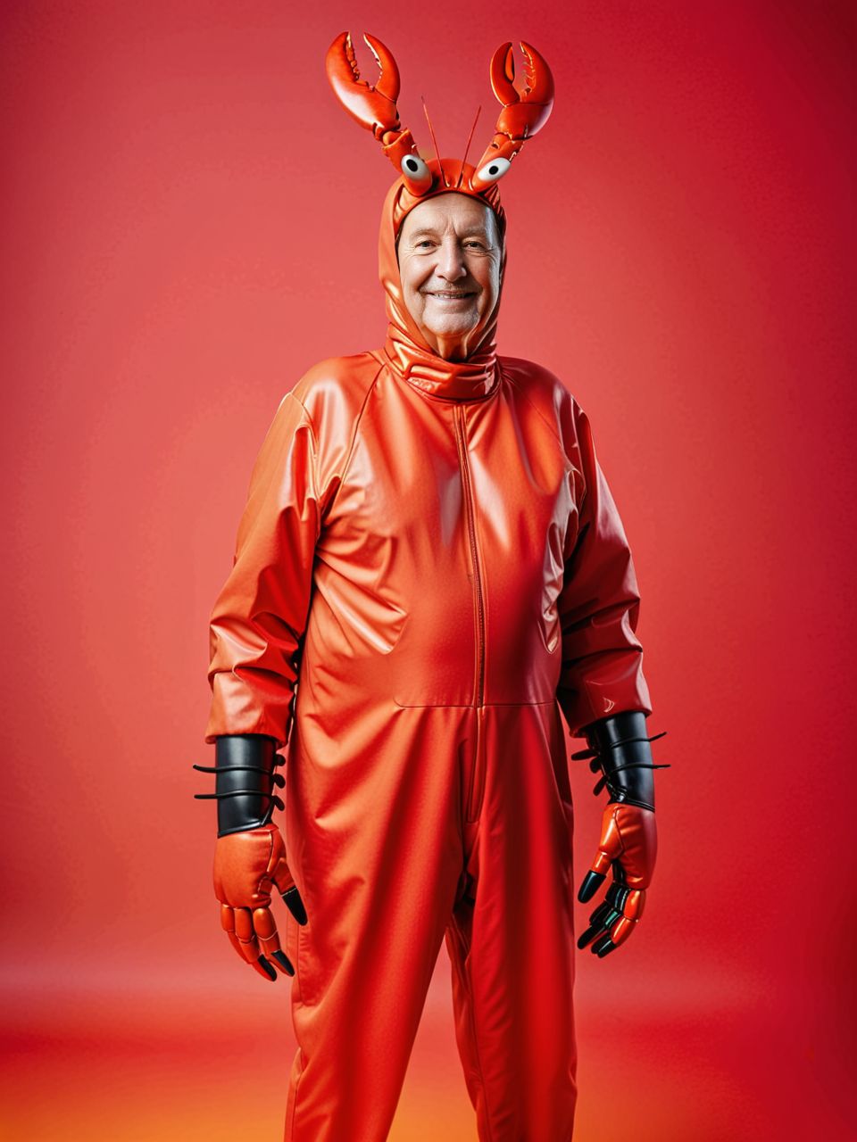 Experience the whimsical charm of an elderly man in a vibrant lobster costume, set against a striking red gradient background. This playful and eye-catching image is sure to spark joy and curiosity. Embrace the unexpected and add a touch of fun to your projects with this delightful stock photo.