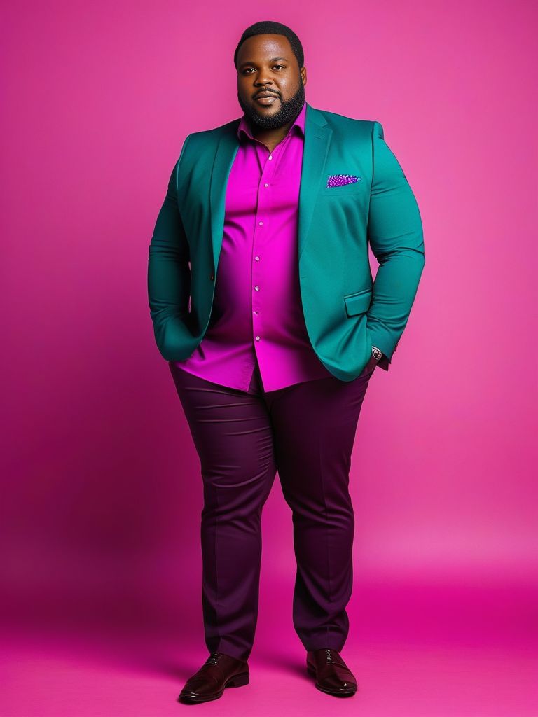This stock photo features a confident plus-size African man wearing a casual yet sharp outfit. He is standing against a vibrant fuchsia gradient background. The man exudes confidence and style, challenging societal norms of beauty and fashion. This image is perfect for promoting body positivity, diversity, and inclusivity. It can be used in various projects such as advertising, social media campaigns, blog posts, and more.
