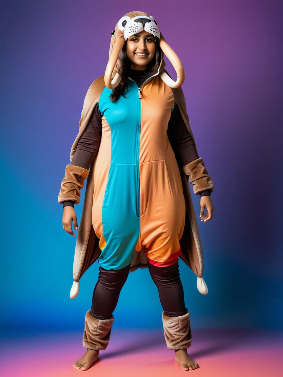 A South Asian young woman sports a walrus costume, captured in full body on a colorful gradient backdrop.