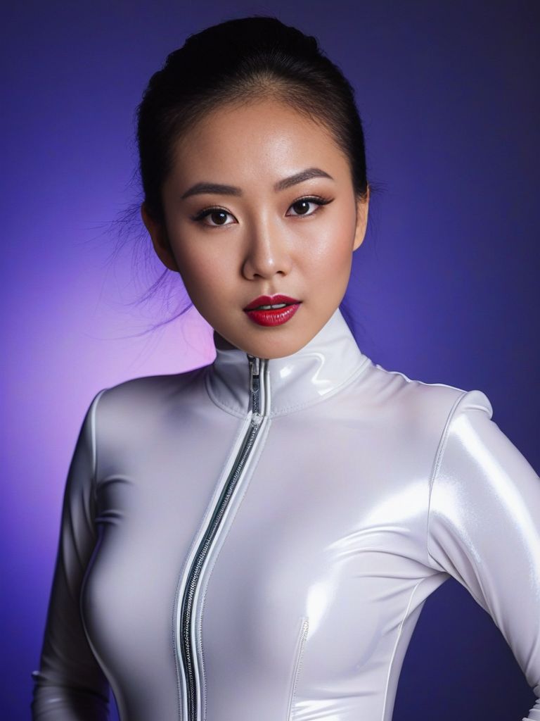 Cute young East Asian woman in a white latex suit, half portrait, dynamic studio lighting.