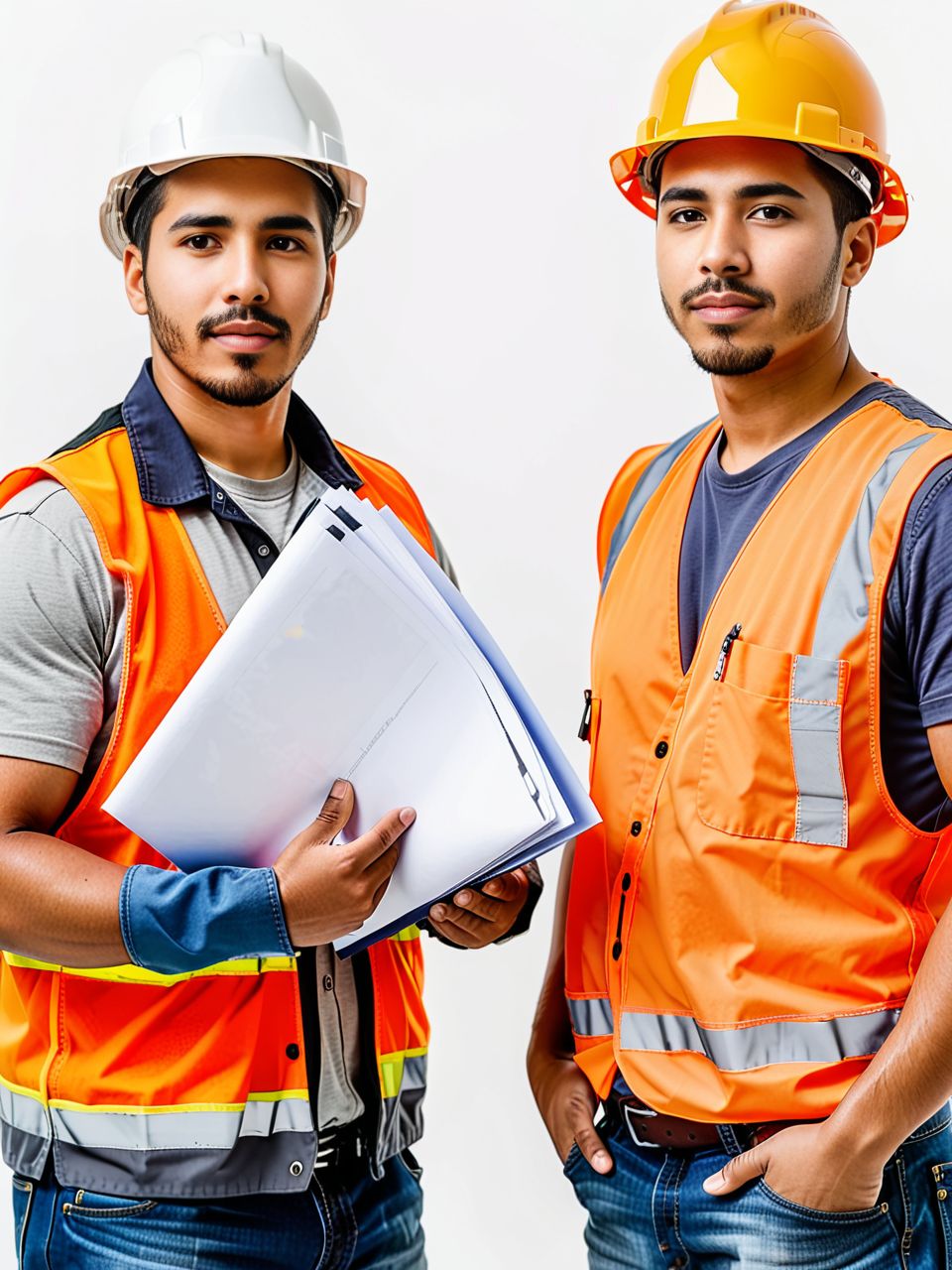 Two close friends, embodying diversity and unity, stand side by side in their respective roles as a construction worker and a surveyor. Their hard hats and construction gear symbolize dedication and teamwork. Against a clean white backdrop, their bond shines through, representing the essence of collaboration and friendship in the professional world.