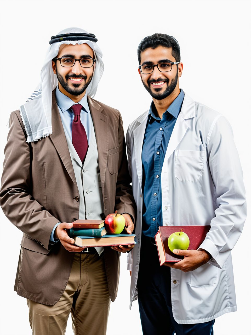Two Middle Eastern men, best friends, one as a school teacher, the other as a librarian, with books and an apple, on a solid white background.