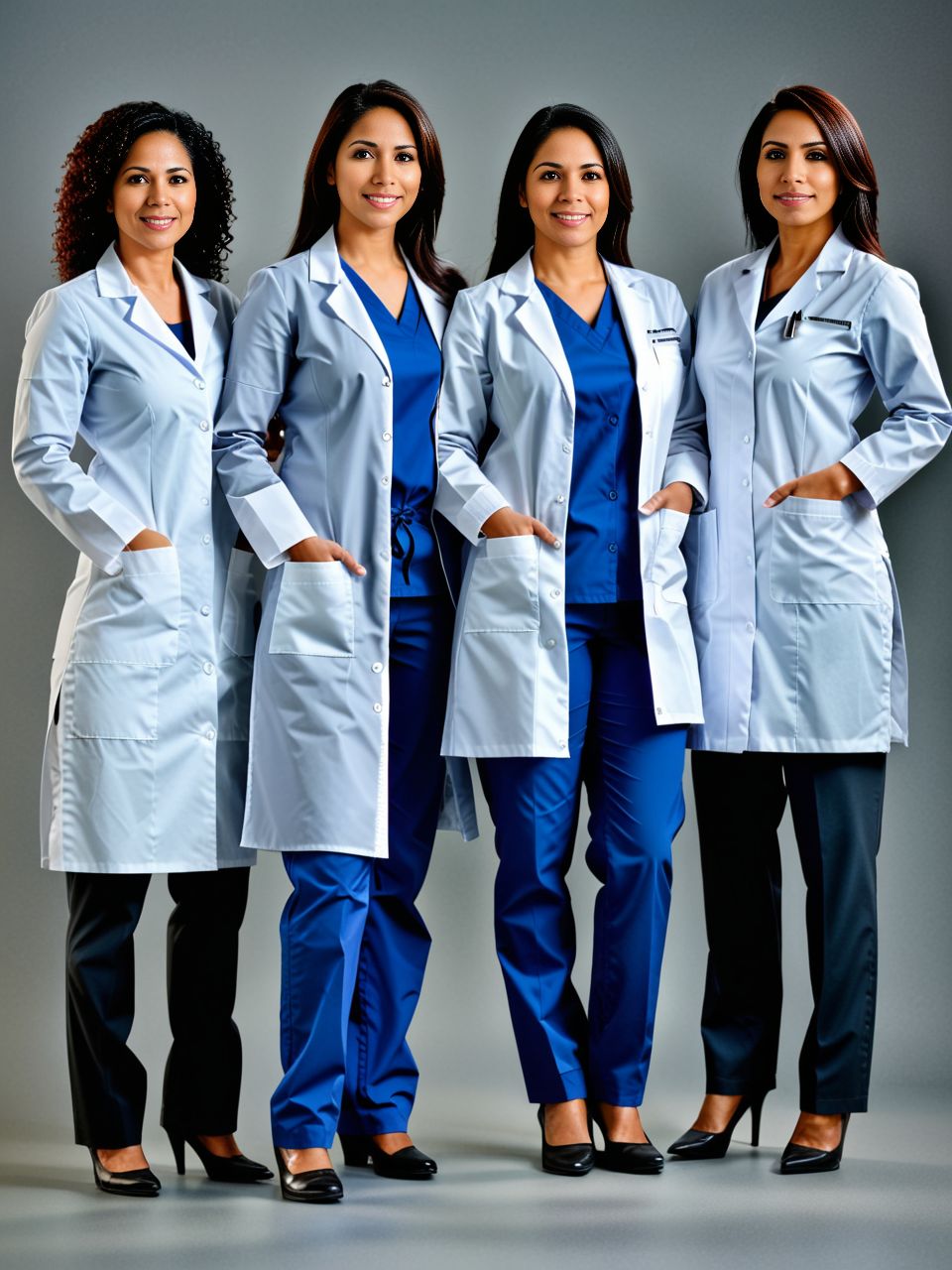 Pharmaceutical professionals, team of four Hispanic women, full-body portrait on a gray background in lab attire.