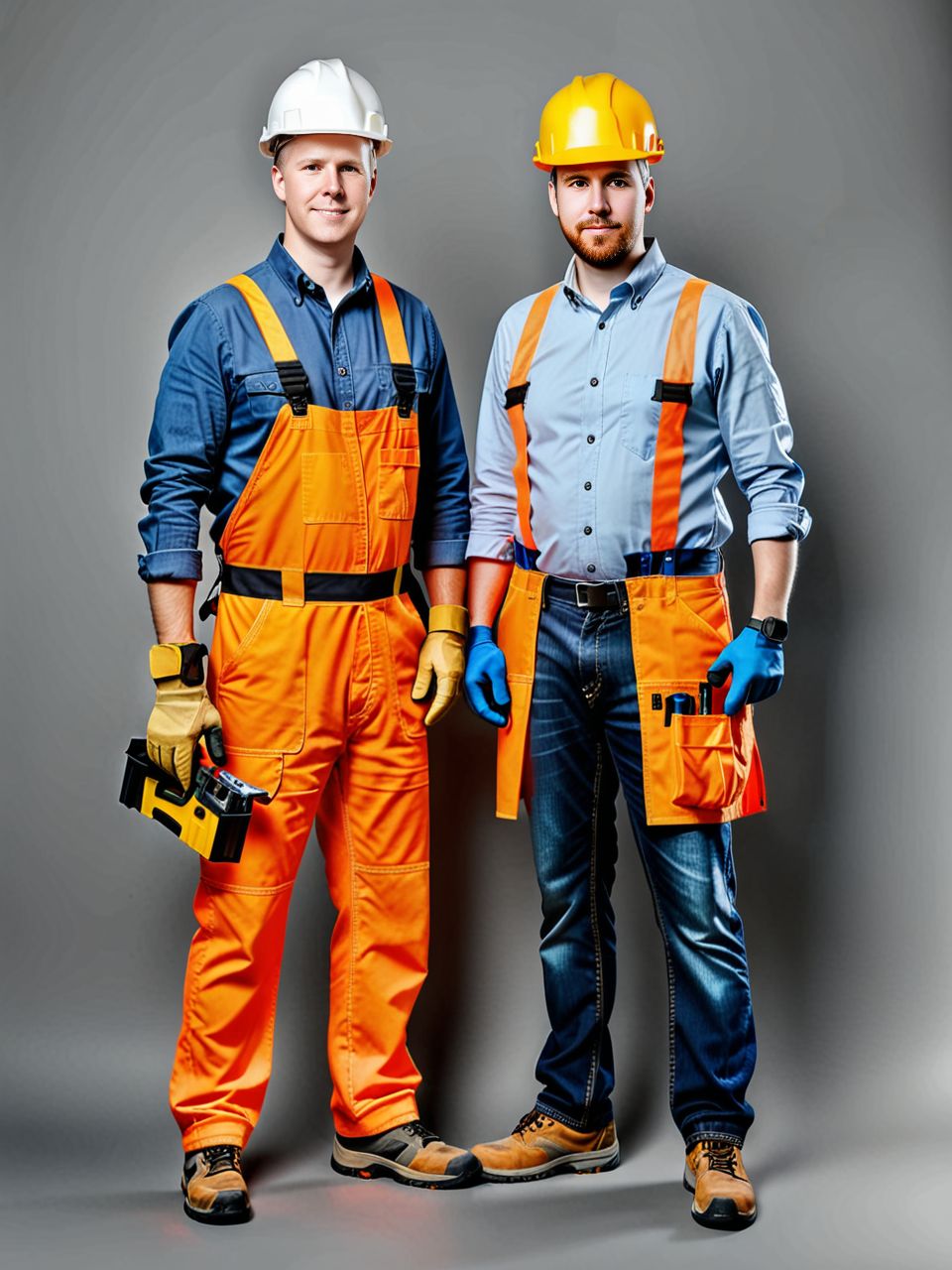 In a unique display of friendship and collaboration, two best friends, embodying the roles of a skilled carpenter and an expert electrician, stand side by side. Each equipped with their tools and safety gear, they symbolize the essence of teamwork and expertise. Against a neutral gray backdrop, their camaraderie shines through, showcasing the beauty of diverse talents coming together.