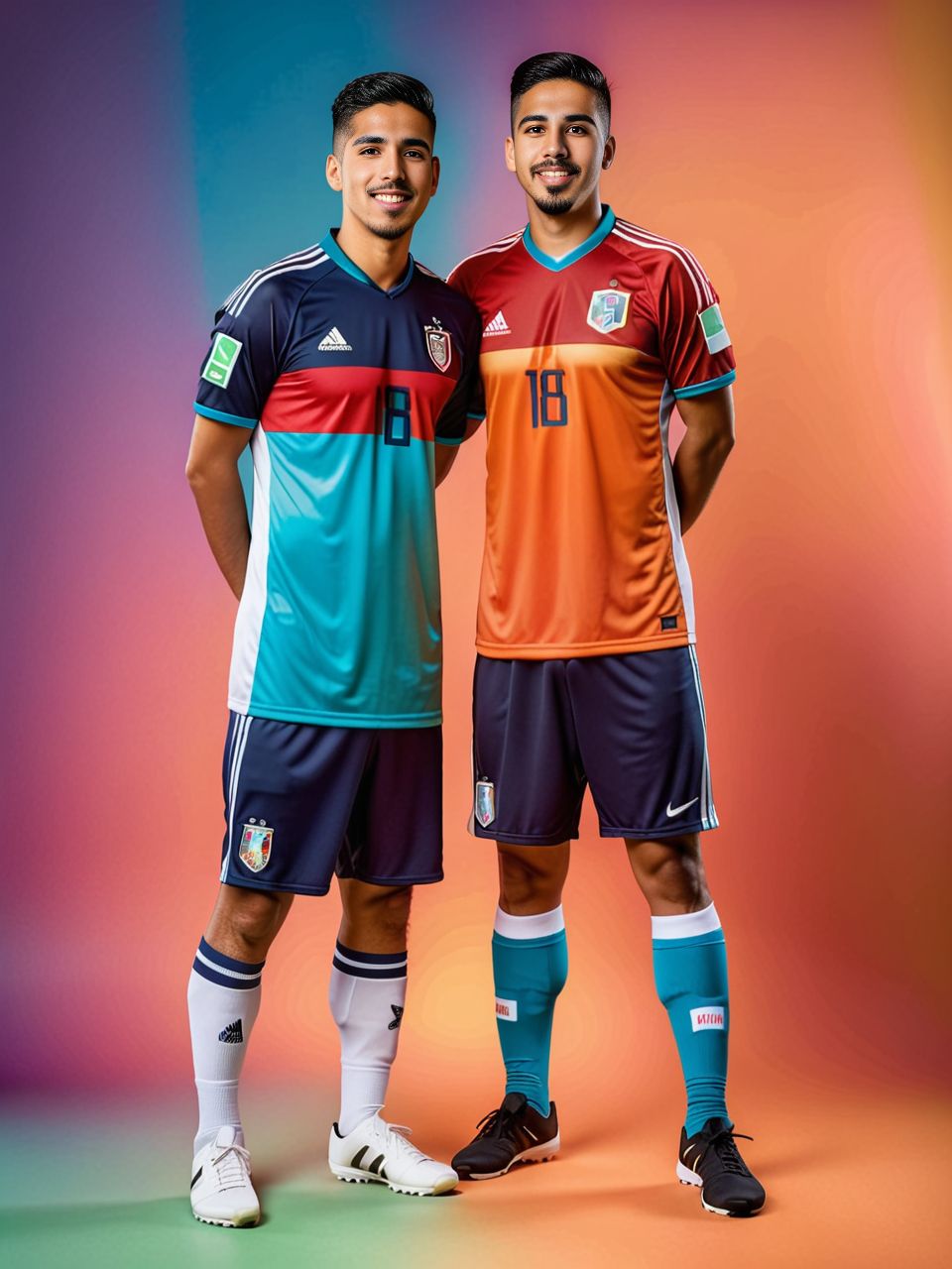 Experience the vibrant energy of two young Hispanic men as they showcase their friendship and love for soccer in this captivating full-body portrait. The colorful gradient background adds a modern touch to their athletic appearance, capturing the essence of camaraderie and passion. Perfect for sports enthusiasts and lifestyle content creators.
