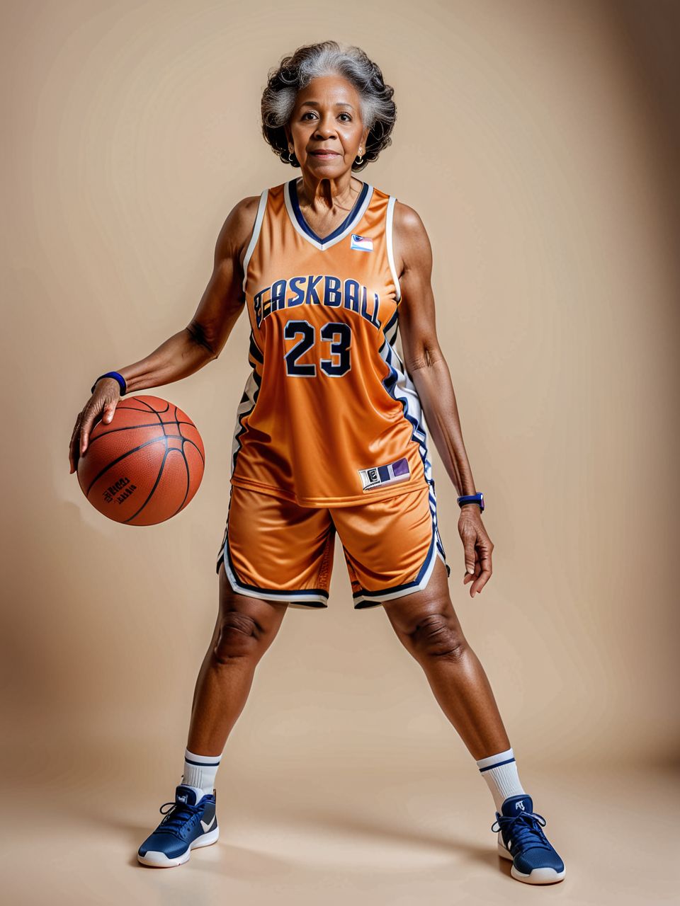 Elderly Black woman in a full body sports costume, as a basketball player with a jersey and ball, against a gradient background.