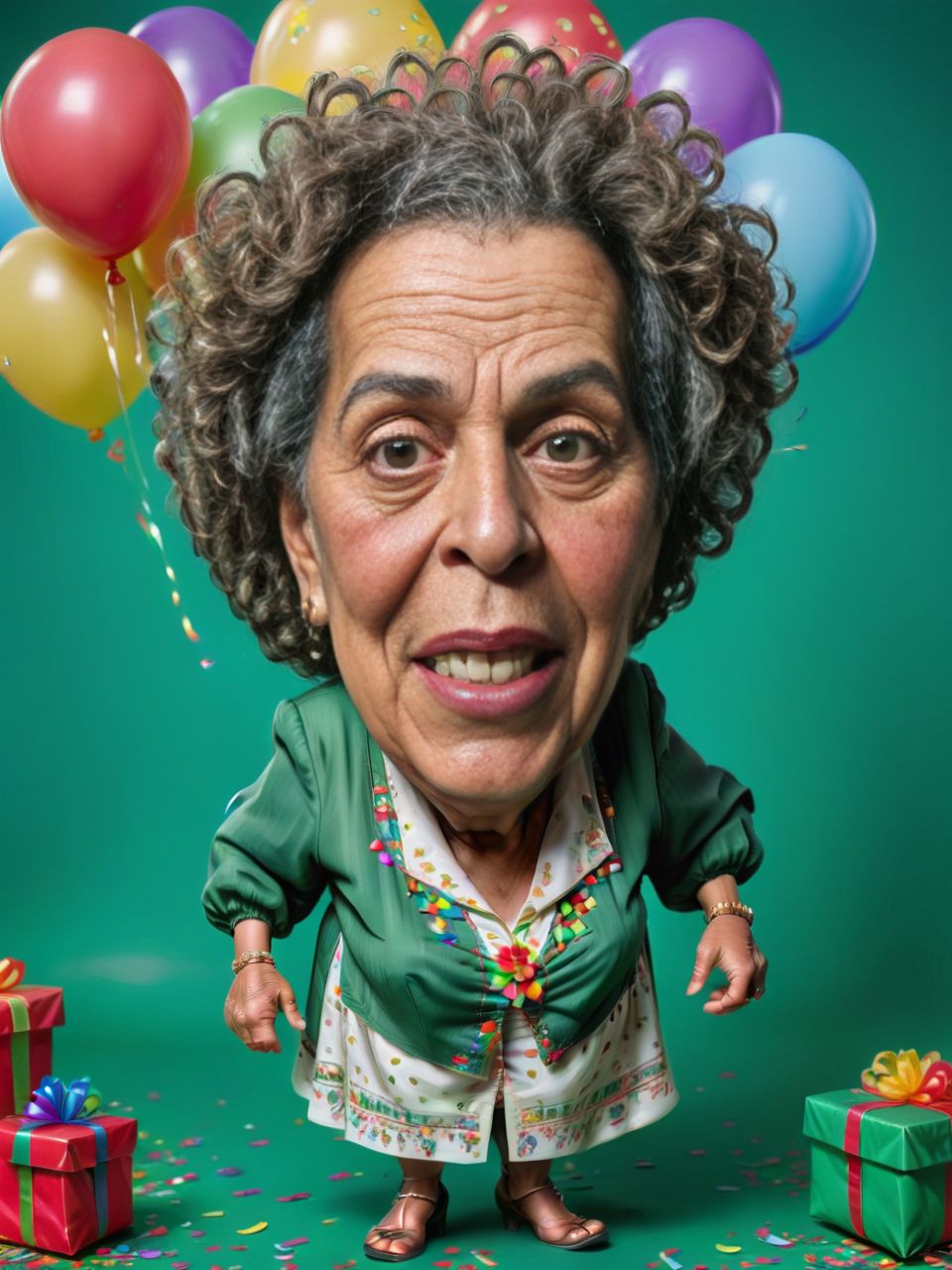 A birthday caricature of an elderly Latina woman with curly hair, wearing a traditional dress, surrounded by balloons on a solid green background with confetti and gifts. funny,