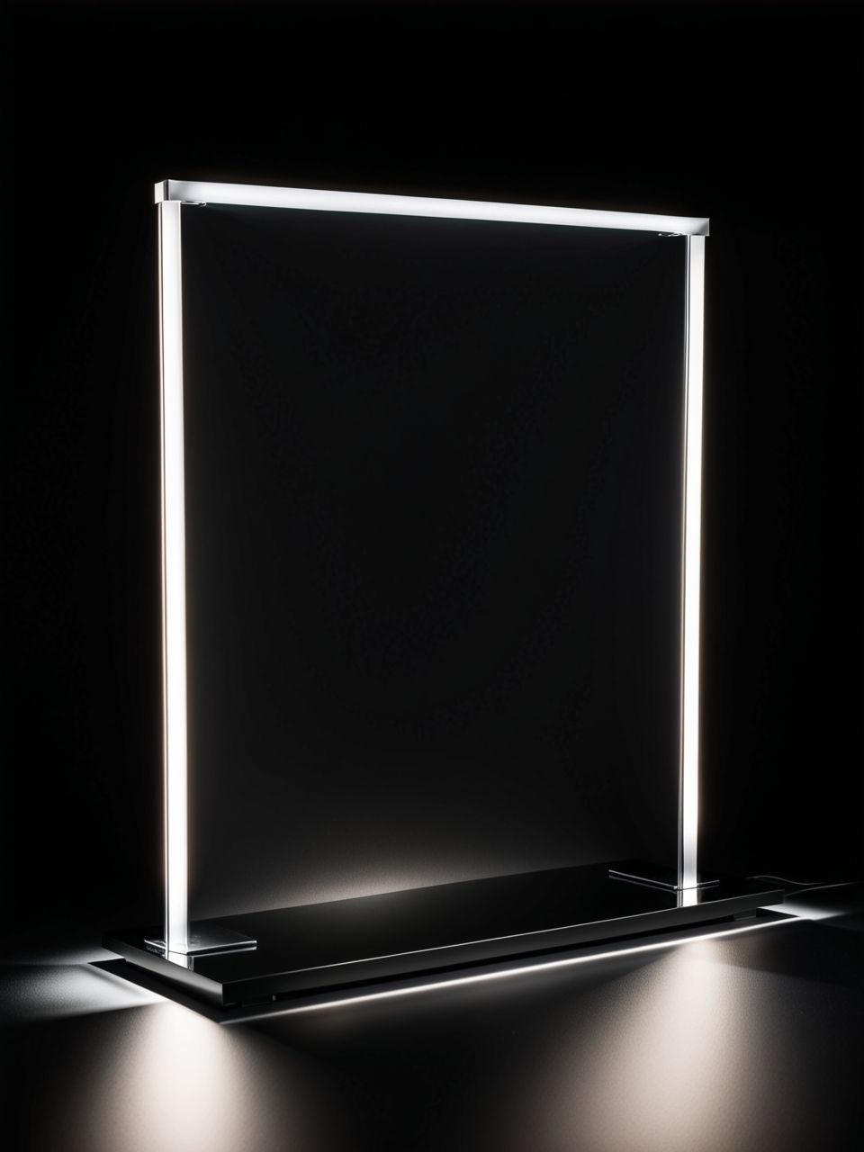 reflective black stand with subtle lighting and soft shadows on a black background, suitable for high-end product photography