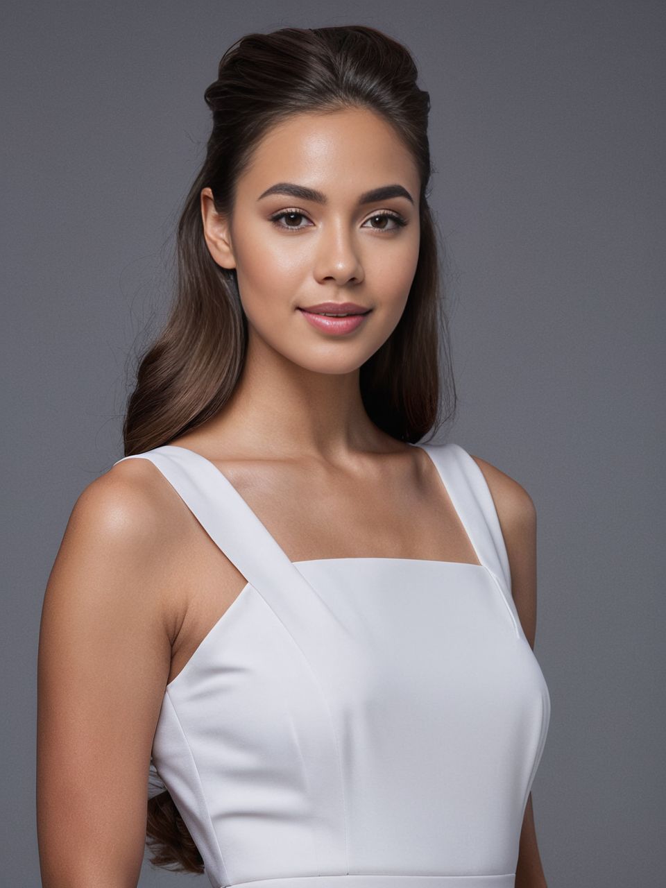 A stunning young woman showcases a white dress with a chic half-up half-down hairstyle, exuding grace and style against a sleek gray backdrop. This model captures the essence of sophistication and fashion-forward design.