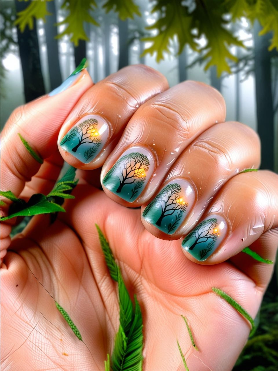 Enchanted forest nail art with mystical trees and fog on long, oval nails, fairy-like for fair skin.