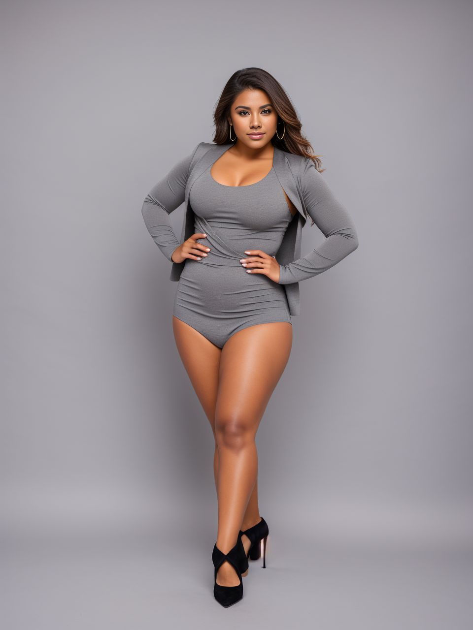 A stunning fashion model, a young Hispanic woman, is posing in professional apparel against a solid gray background. This full-body portrait captures her elegance and confidence. She exudes style and grace, making this image perfect for fashion-related projects or advertisements. With her captivating presence, she can easily become the center of attention in any design. Explore the beauty and versatility of this image for your creative endeavors.