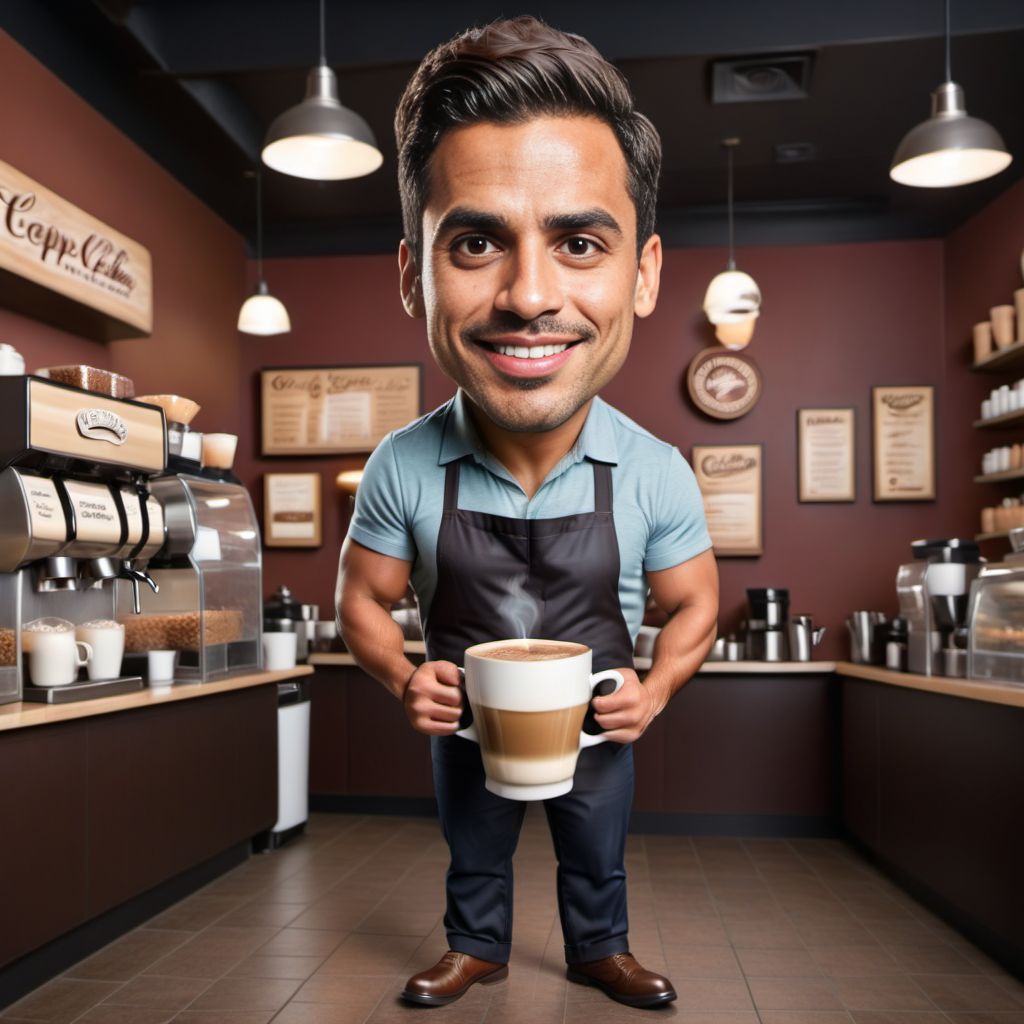 This image features a full body caricature of a young, trendy Hispanic man working as a barista. He is seen making a gigantic cup of coffee. The caricature is done in a unique and artistic style, adding a touch of creativity to the image. This image is perfect for coffee-related designs, cafe promotions, or any project that requires a fun and energetic vibe.