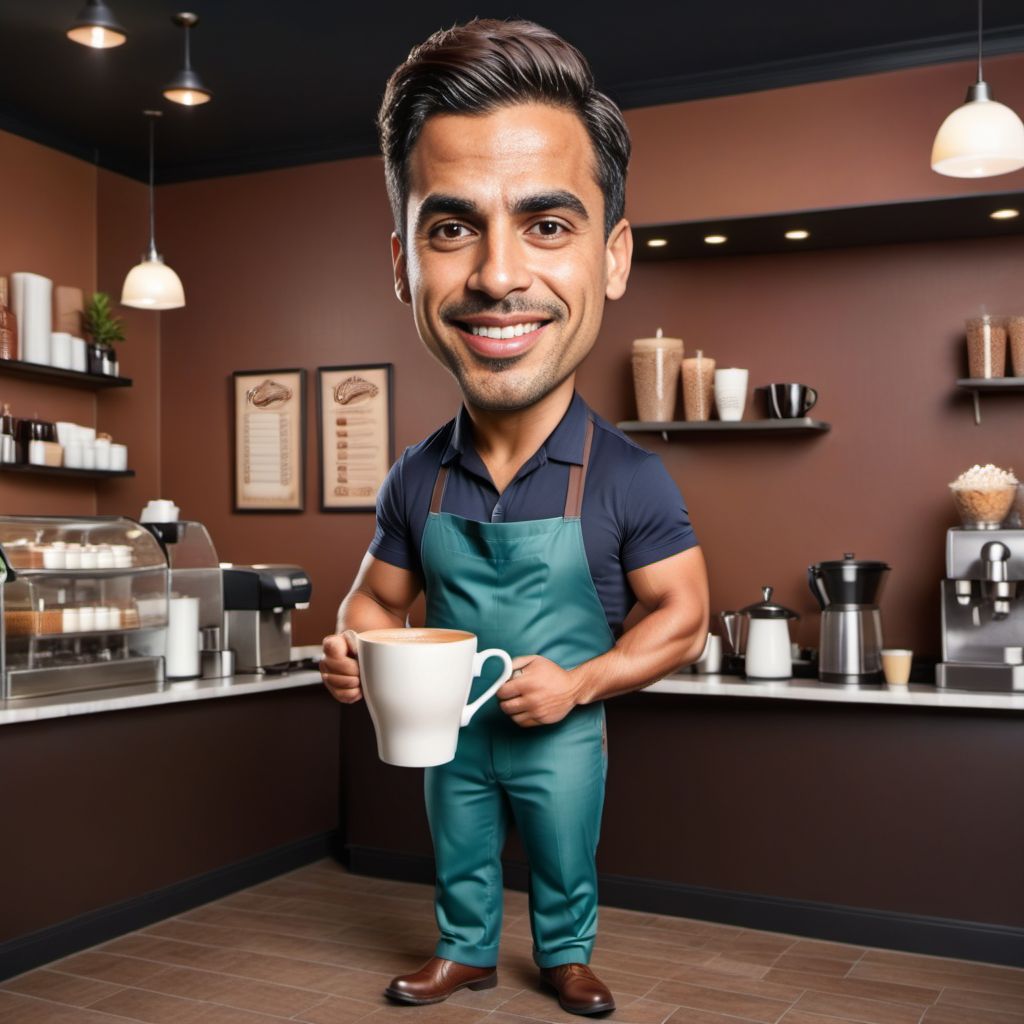 This image features a full body caricature of a young, trendy Hispanic man working as a barista. He is seen making an enormous cup of coffee. The caricature is done in a XL style, with exaggerated features and vibrant colors. This image is perfect for coffee-related designs, cafe promotions, and illustrations depicting baristas.