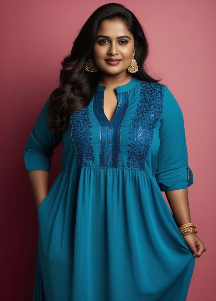 Full-body portrait of a plus-size South Asian woman in a studio, dressed in a stylish, casual dress.
