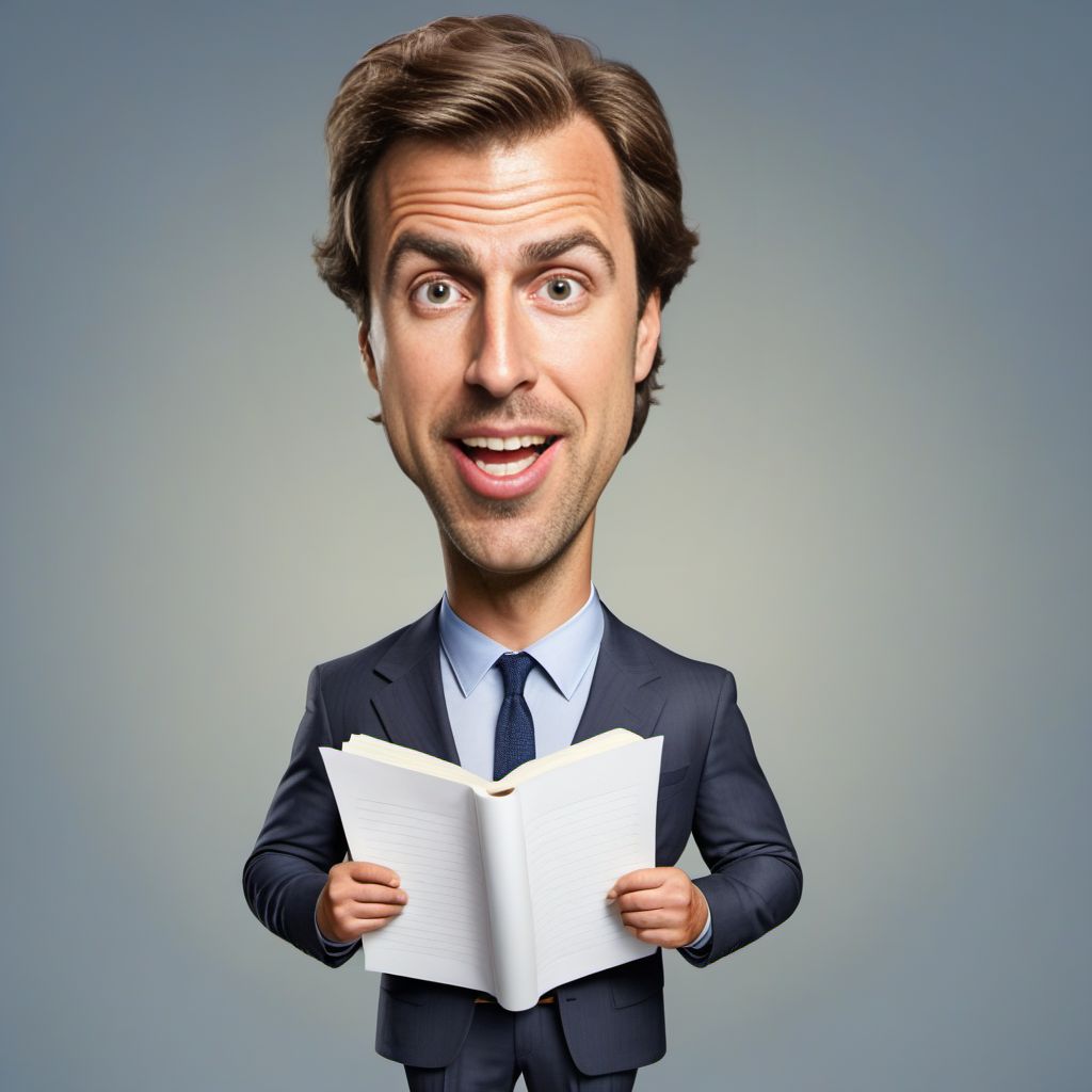 Funny caricature of a young, suave Caucasian man, full body, as a journalist with an oversized notepad
