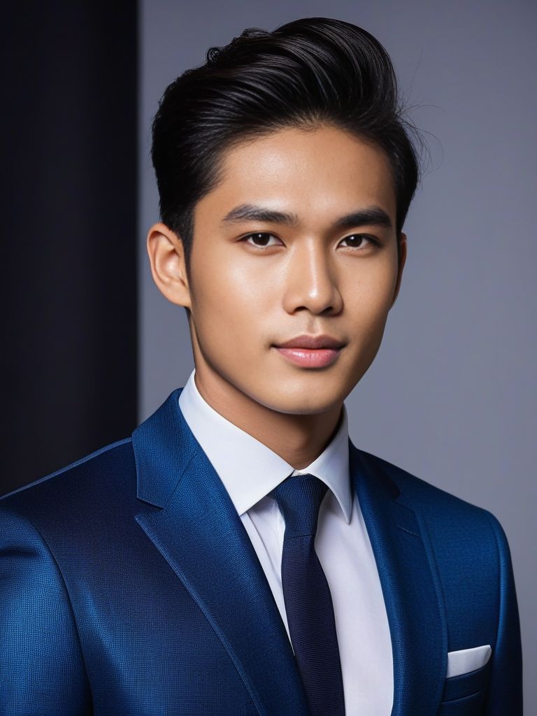 Glamorous young Southeast Asian male model with a polished hairstyle, studio portrait with a modern backdrop.
