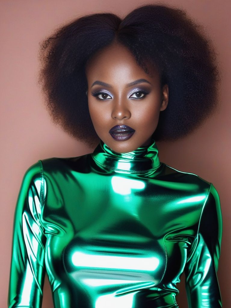 This stunning image features a half portrait of a young East African woman wearing a metallic green latex suit. The elegant lighting enhances her beauty and creates a captivating atmosphere. The vibrant colors and unique outfit make this photo perfect for fashion, beauty, and futuristic themes. Add a touch of glamour to your projects with this eye-catching image.