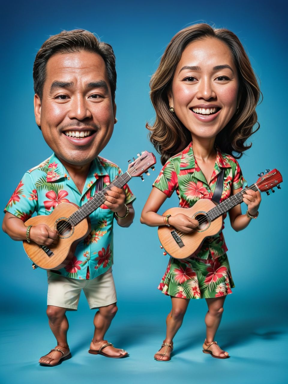 A caricature couple portrait of a Hawaiian couple, both in floral shirts, playing ukuleles on a solid aqua background