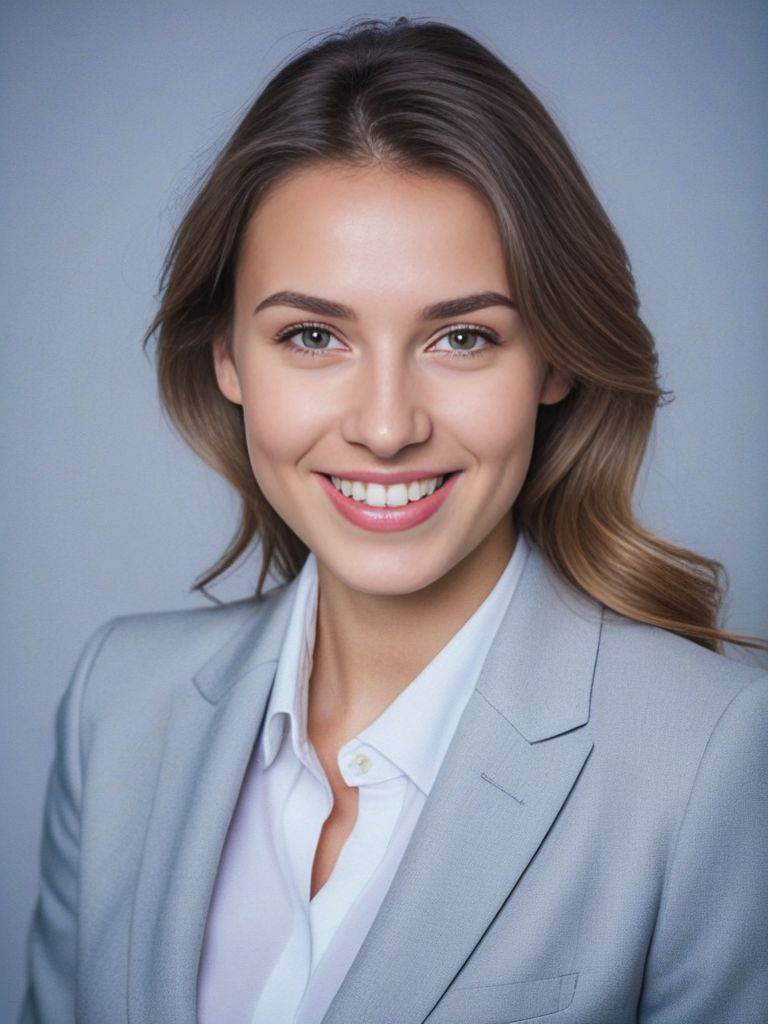This is a headshot of a smiling young East European woman. She is wearing a light grey suit and the photo is taken against a light backdrop. The woman looks confident and friendly. This image can be used for various purposes such as business presentations, website banners, or social media profiles.