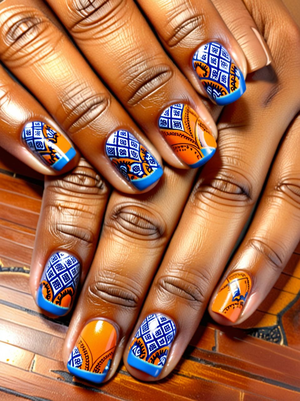 Discover the mesmerizing beauty of Moroccan-inspired nail art featuring intricate patterns in vibrant blues and oranges. Perfect for adding a touch of cultural elegance to your style.