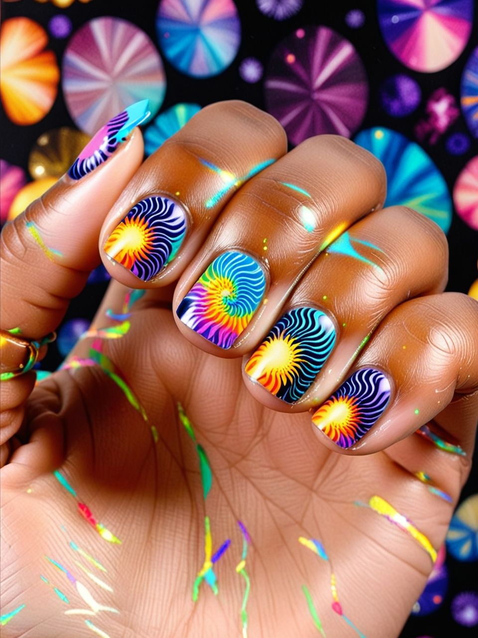 Vibrant multicolor patterns swirl on short, rounded nails, creating a mesmerizing kaleidoscope effect. This nail art is perfect for those seeking psychedelic inspiration and unique nail designs.