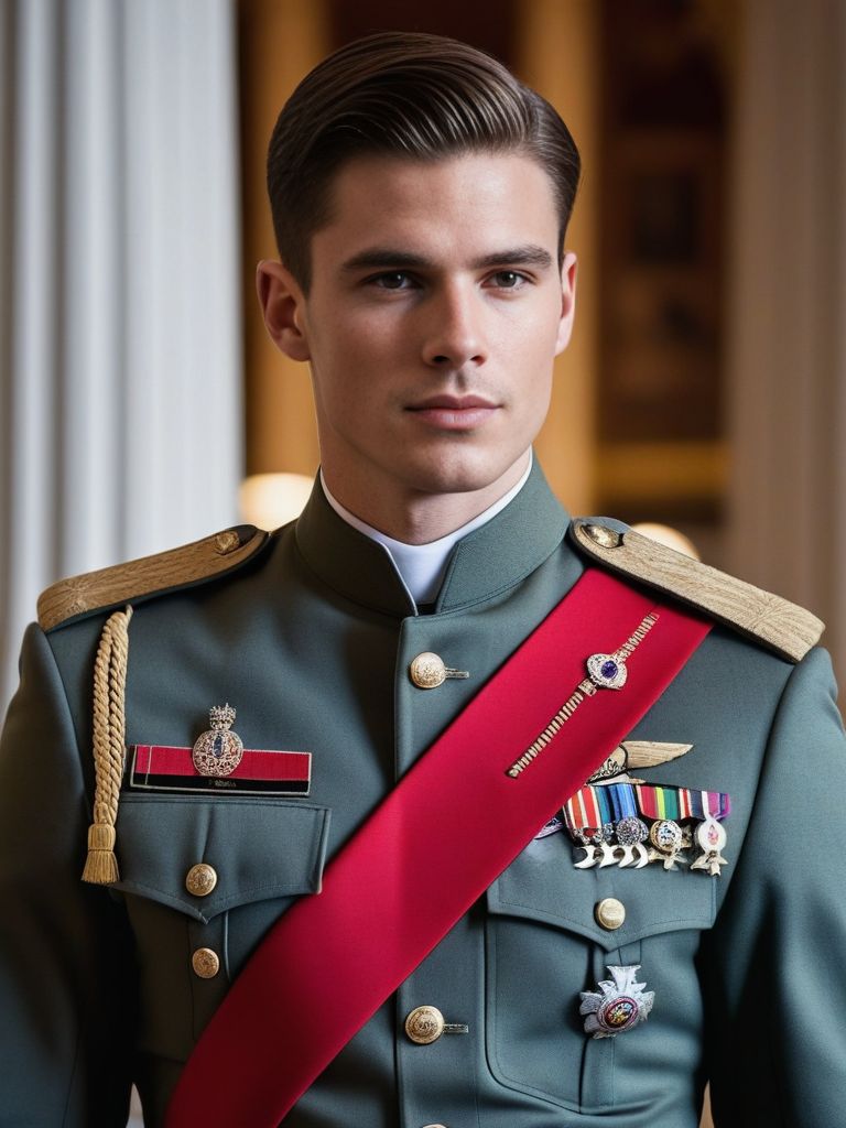 A male model with a clean, military cut, dressed in a crisp uniform, stands against a dignified and ceremonial backdrop. This striking image captures the essence of discipline and professionalism.