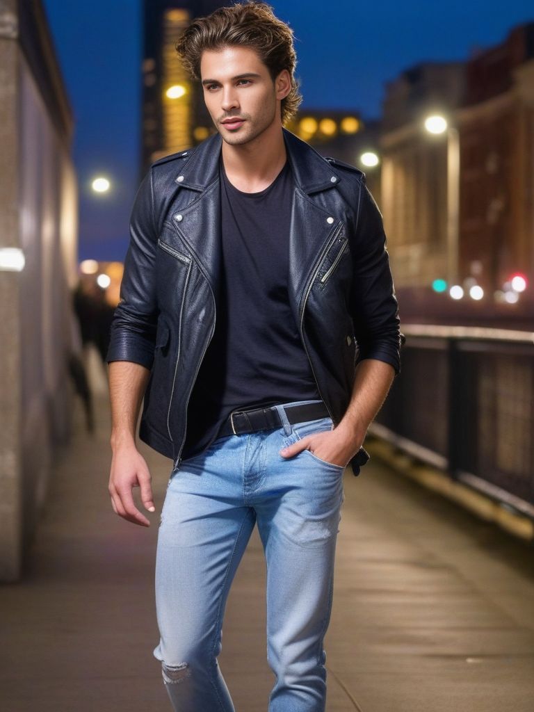 Male model with a trendy disheveled look, in a hip, urban outfit, against a lively, city nightlife background.
