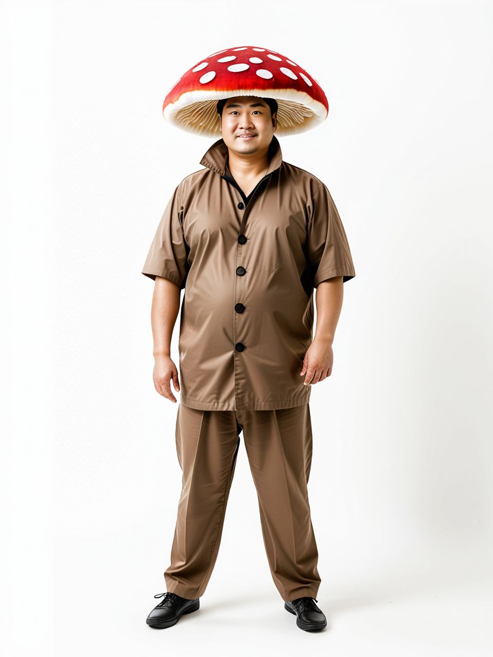 Discover the whimsical world of Pincel with this unique image of a middle-aged, stocky Asian man creatively dressed as a mushroom. Embrace the creativity and imagination in this full-body shot against a clean white background. Let your imagination run wild with the possibilities this image holds.