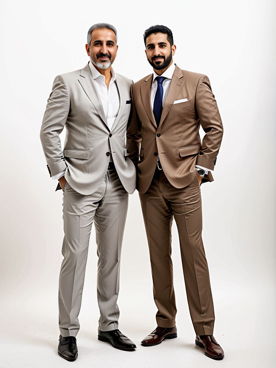 Two close friends of Middle Eastern descent, exuding confidence and style in their well-fitted blazers and trousers. Their mature and distinguished appearance adds a touch of sophistication to any project or design. The stark white background enhances their presence, making them the focal point of the image.