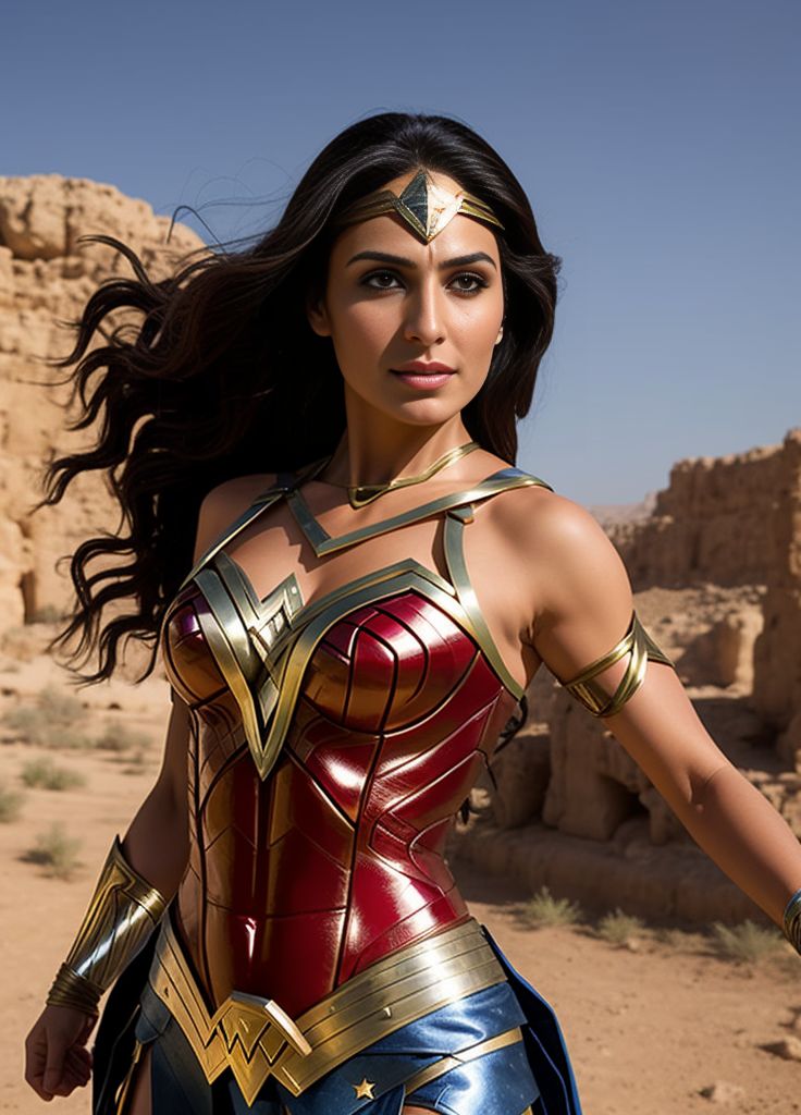 Middle-Eastern SuperHero Woman with the warrior spirit of Wonder Woman, in a heroic stance with a lasso.