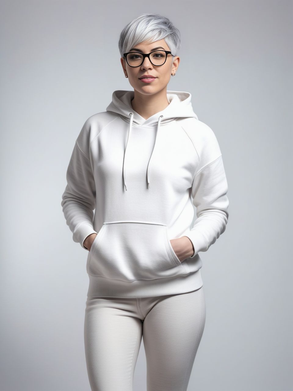 A white canvas showcases a full body portrait of a woman with a pixie cut and glasses, wearing a white hoodie, her figure athletic, embodying diversity and modern style white hoodie