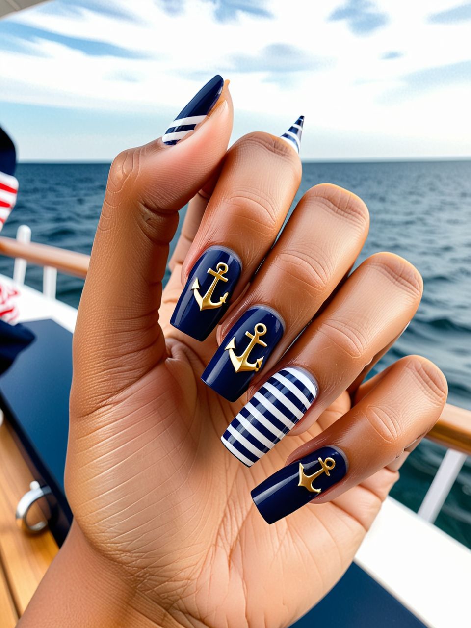 Get ready to set sail with these stunning nautical-themed coffin-shaped nails featuring anchors, stripes, and a sailor hat accent. Perfect for summer vibes and beach days.